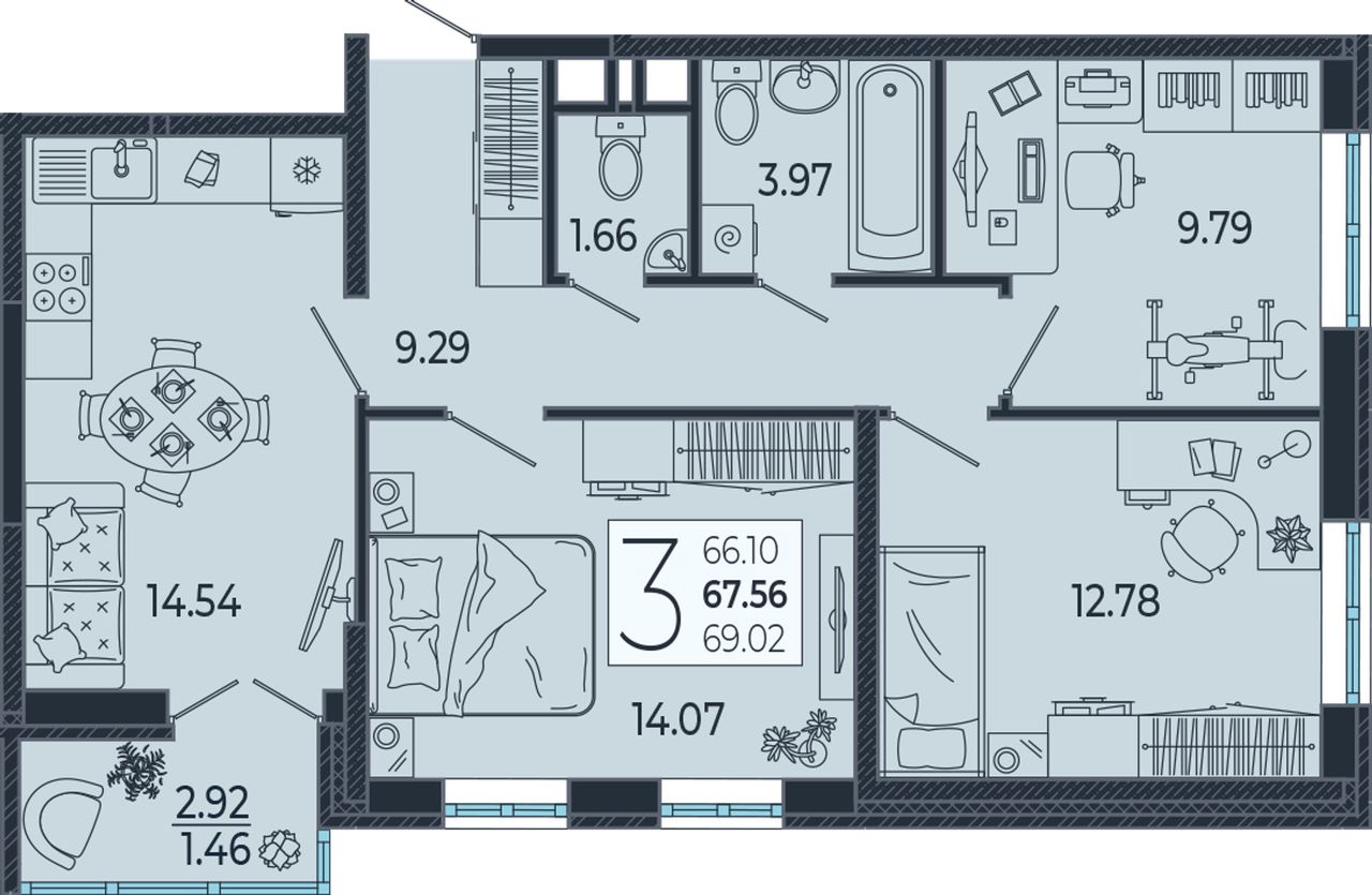 3-комнатная — 67,56 м² 12/21 эт. в Эстет