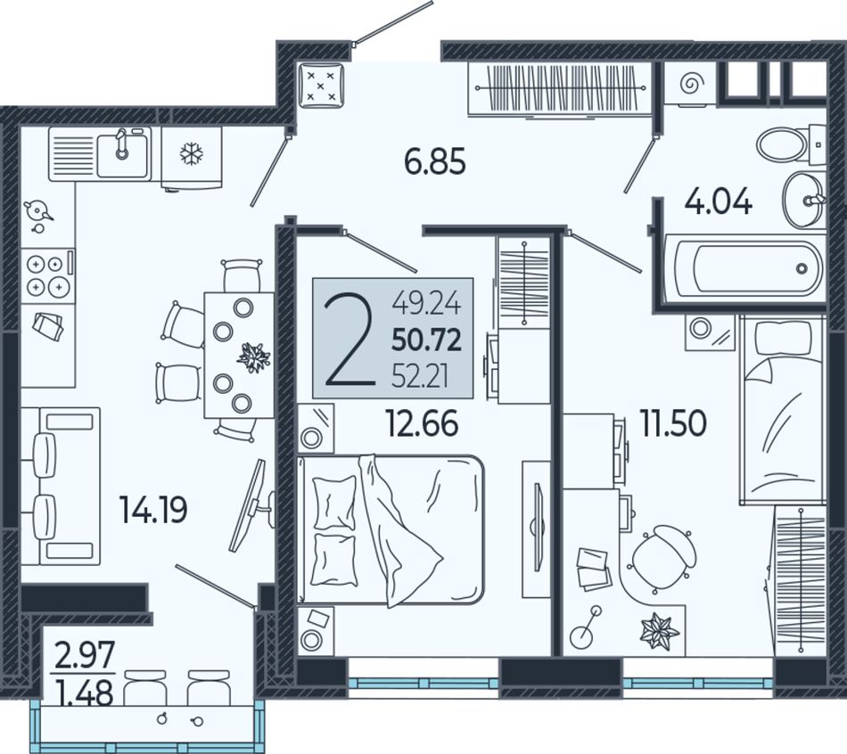 2-комнатная — 50,72 м² 18/21 эт. в Эстет