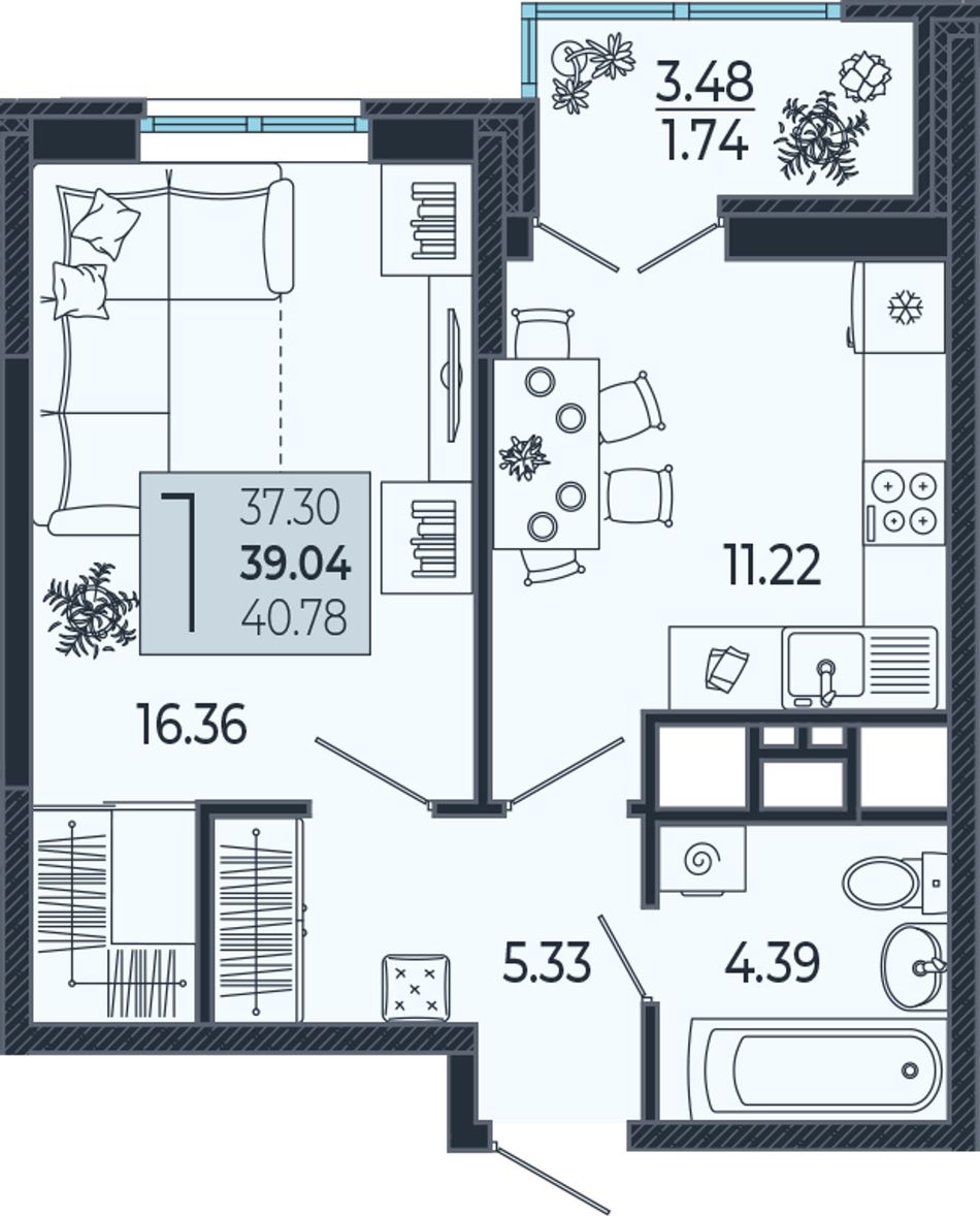 1-комнатная — 39,2 м² 19/21 эт. в Эстет