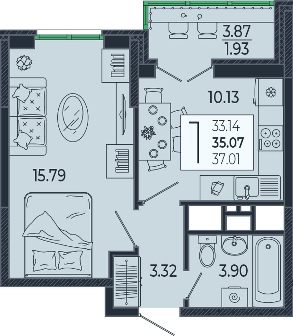 1-комнатная — 35,07 м² 20/21 эт. в Эстет