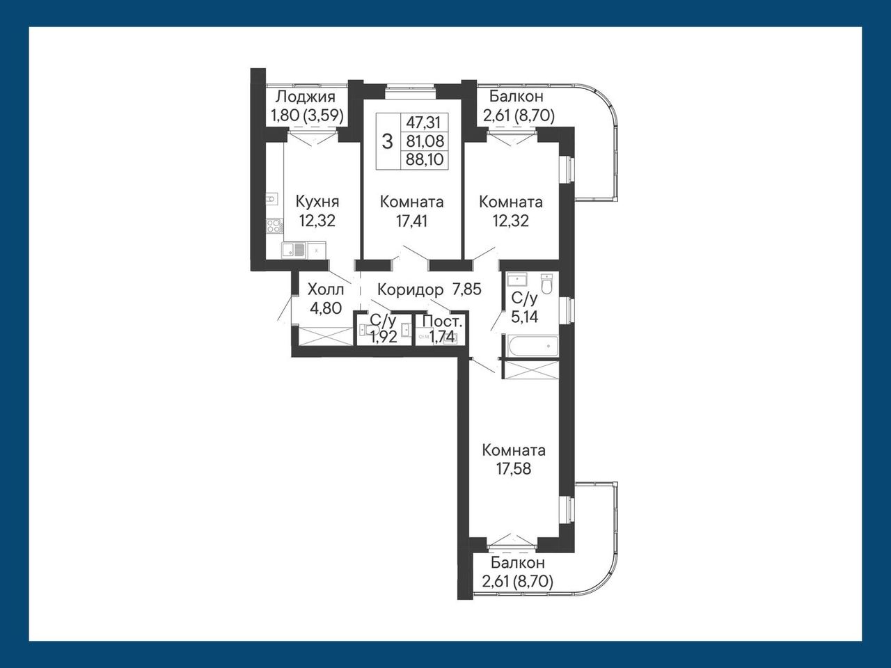 3-комнатная — 88,1 м² 3/8 эт. в Ривьера