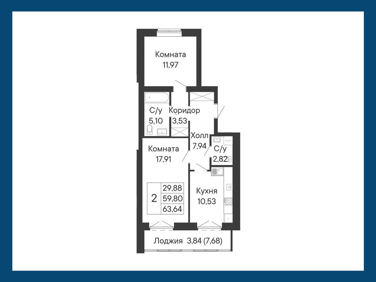 2-комнатная — 63,64 м² 7/8 эт. в Ривьера