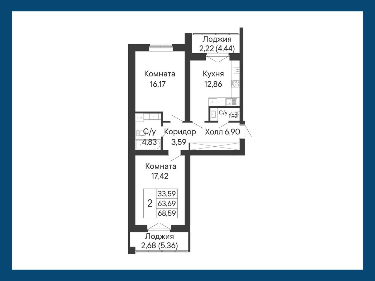2-комнатная — 68,59 м² 8/8 эт. в Ривьера