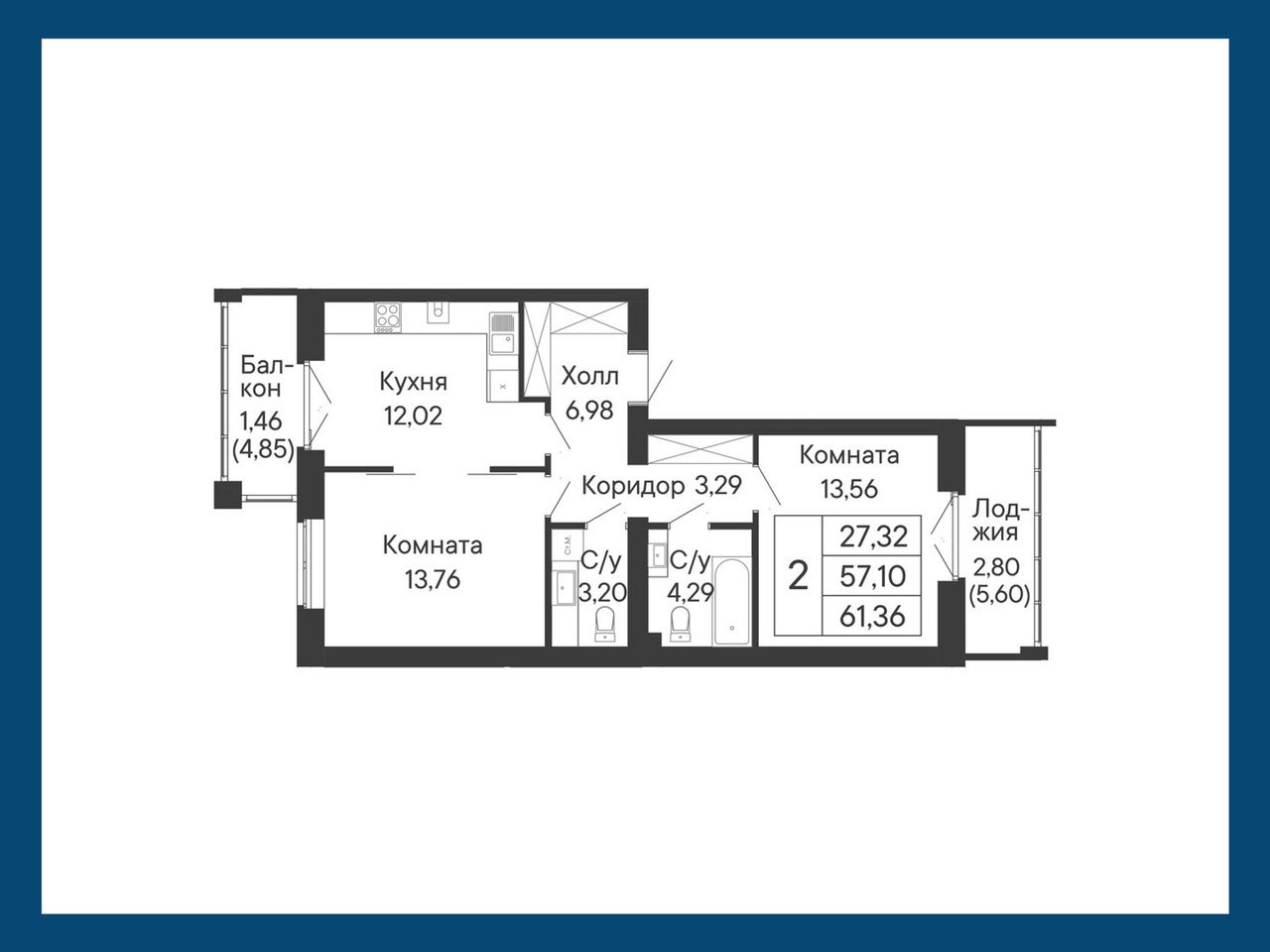 2-комнатная — 61,36 м² 7/8 эт. в Ривьера