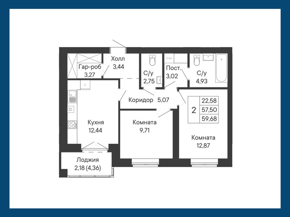 2-комнатная — 59,68 м² 6/8 эт. в Ривьера
