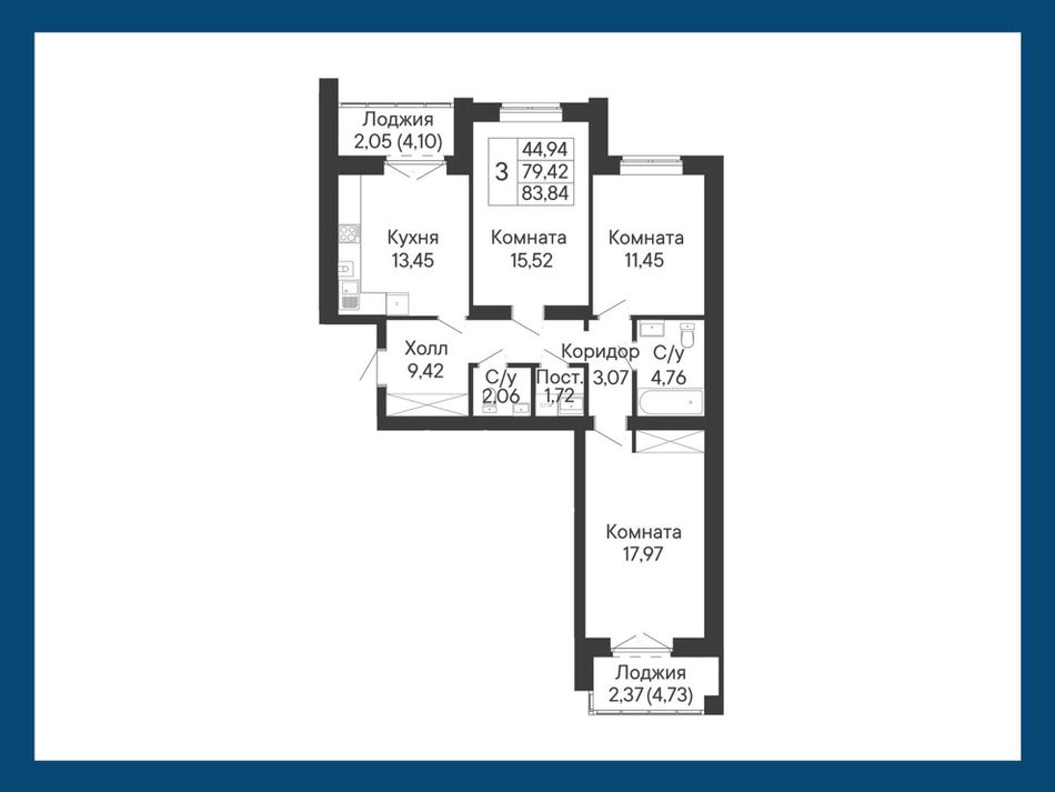 3-комнатная — 83,84 м² 6/8 эт. в Ривьера