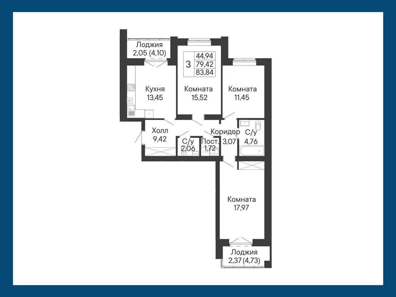 3-комнатная — 83,84 м² 7/8 эт. в Ривьера