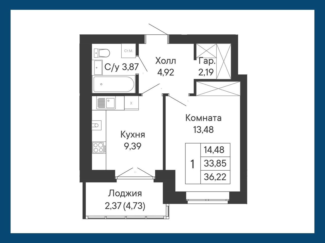 1-комнатная — 36,22 м² 7/8 эт. в Ривьера