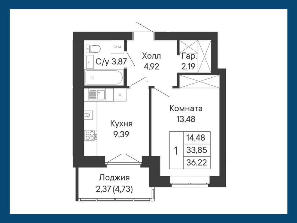 1-комнатная — 36,22 м² 8/8 эт. в Ривьера