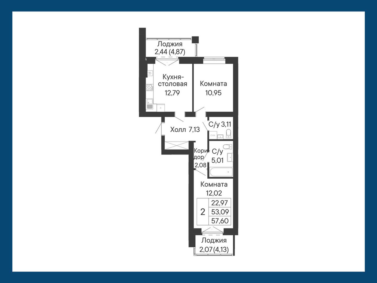2-комнатная — 57,6 м² 8/8 эт. в Ривьера