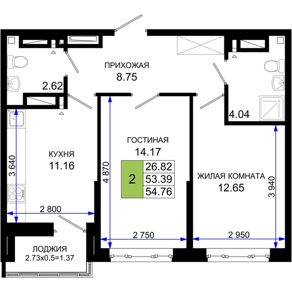 Общая площадь54,76 м²