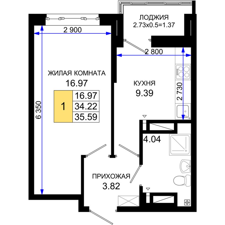 Общая площадь35,59 м²