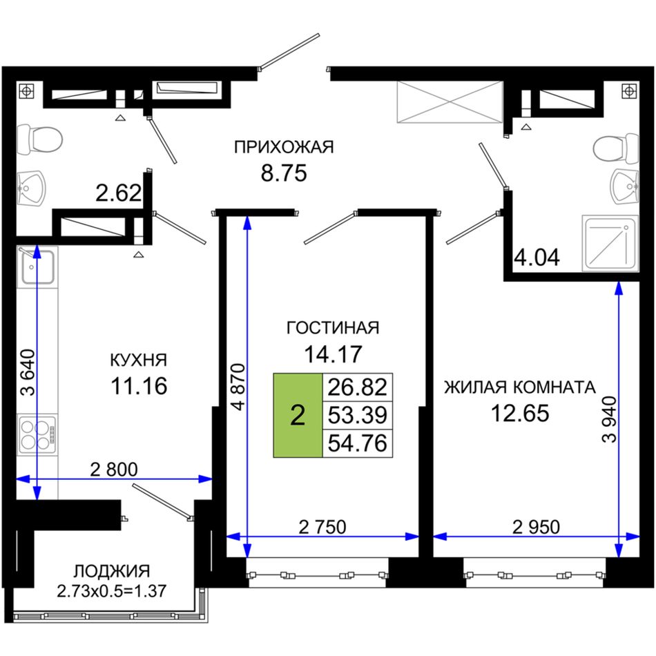 Общая площадь54,76 м²