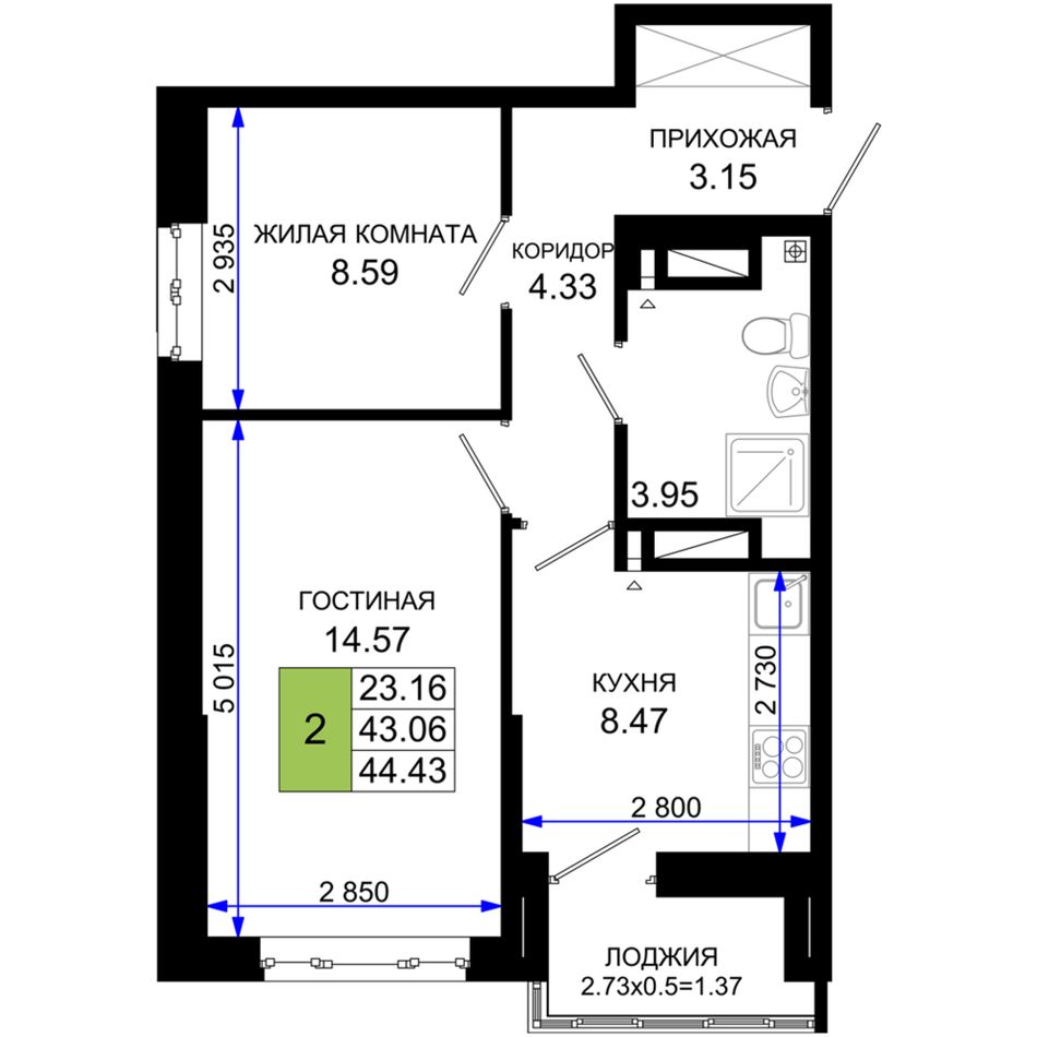 2-комнатная — 44,43 м² 20/25 эт. в Октябрь Парк