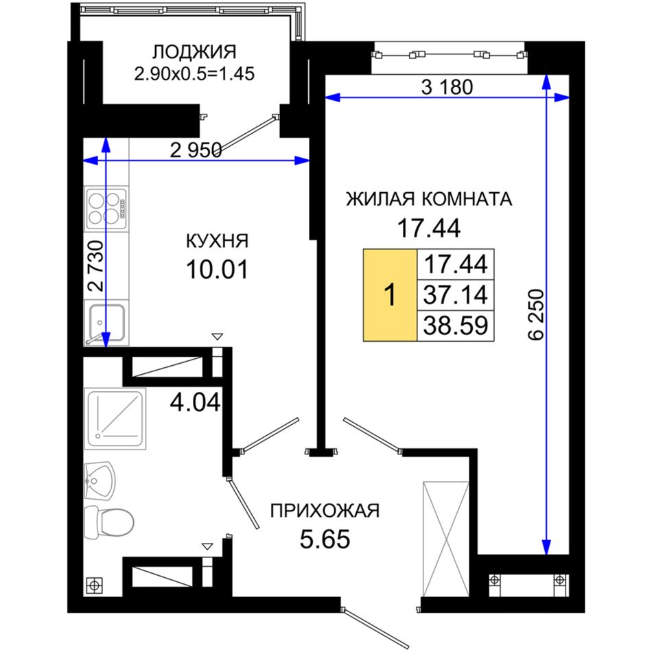 1-комнатная — 38,59 м² 16/25 эт. в Октябрь Парк