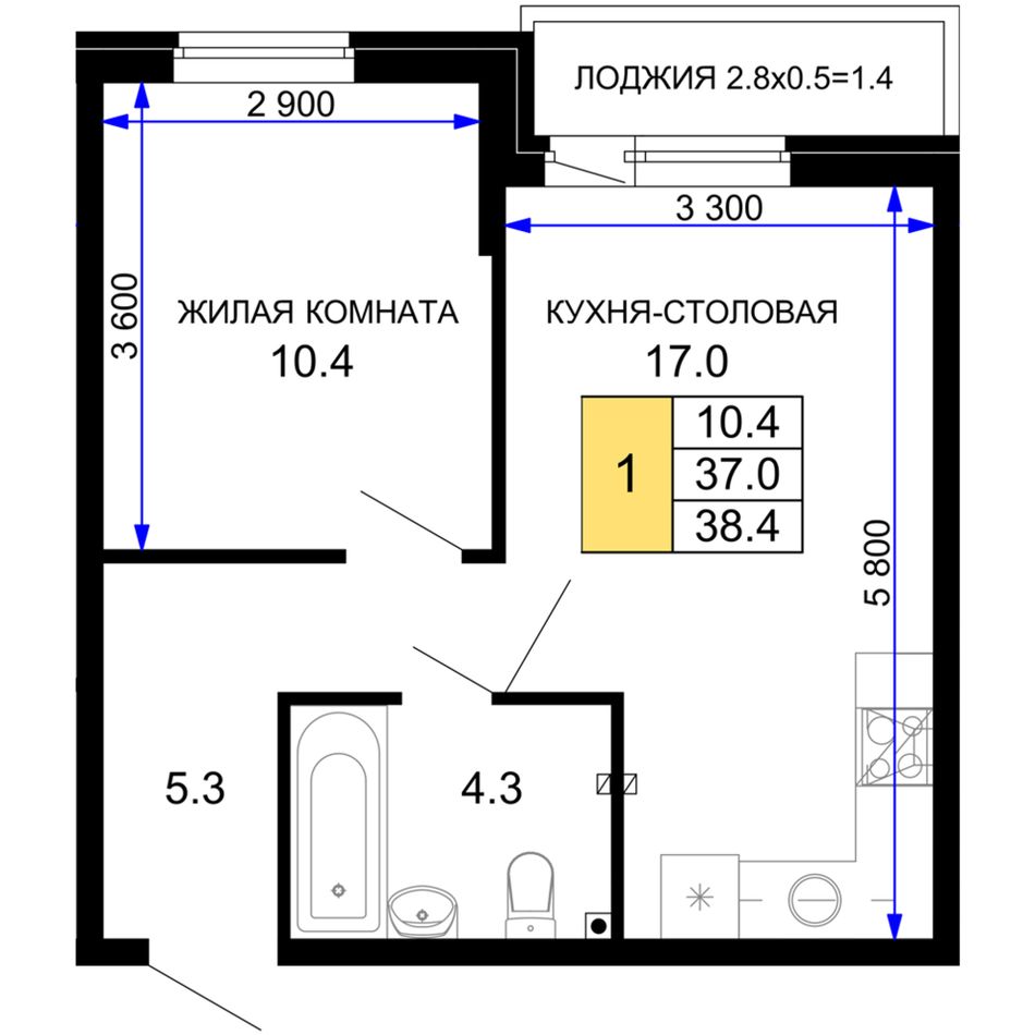1-комнатная — 39 м² 2/16 эт. в Дыхание