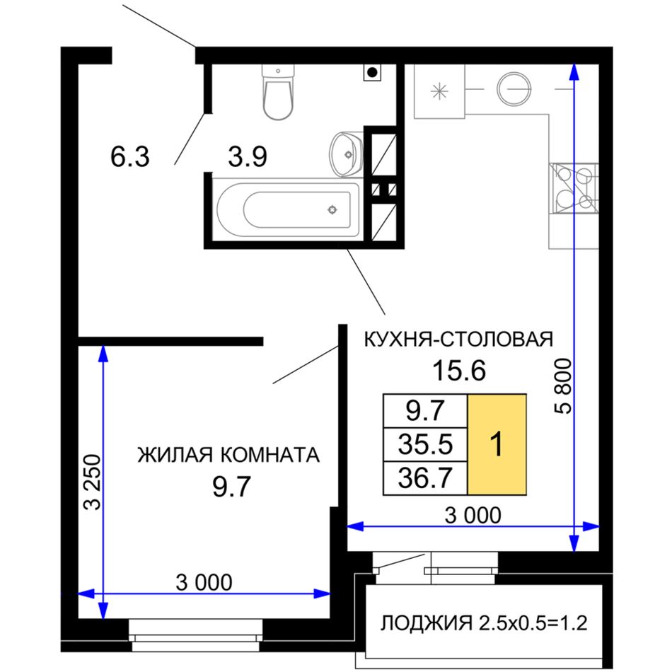 1-комнатная — 37,05 м² 12/16 эт. в Дыхание
