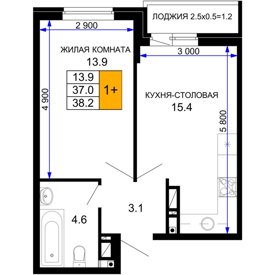 1-комнатная — 38,55 м² 12/16 эт. в Дыхание