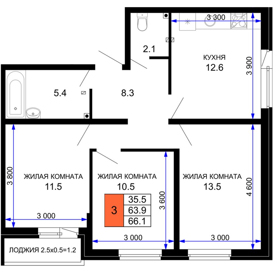 3-комнатная — 66,64 м² 2/16 эт. в Дыхание