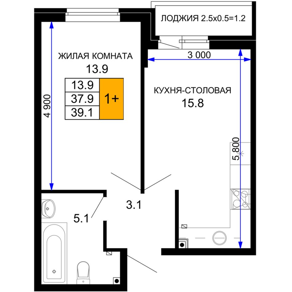 1-комнатная — 39,65 м² 2/16 эт. в Дыхание