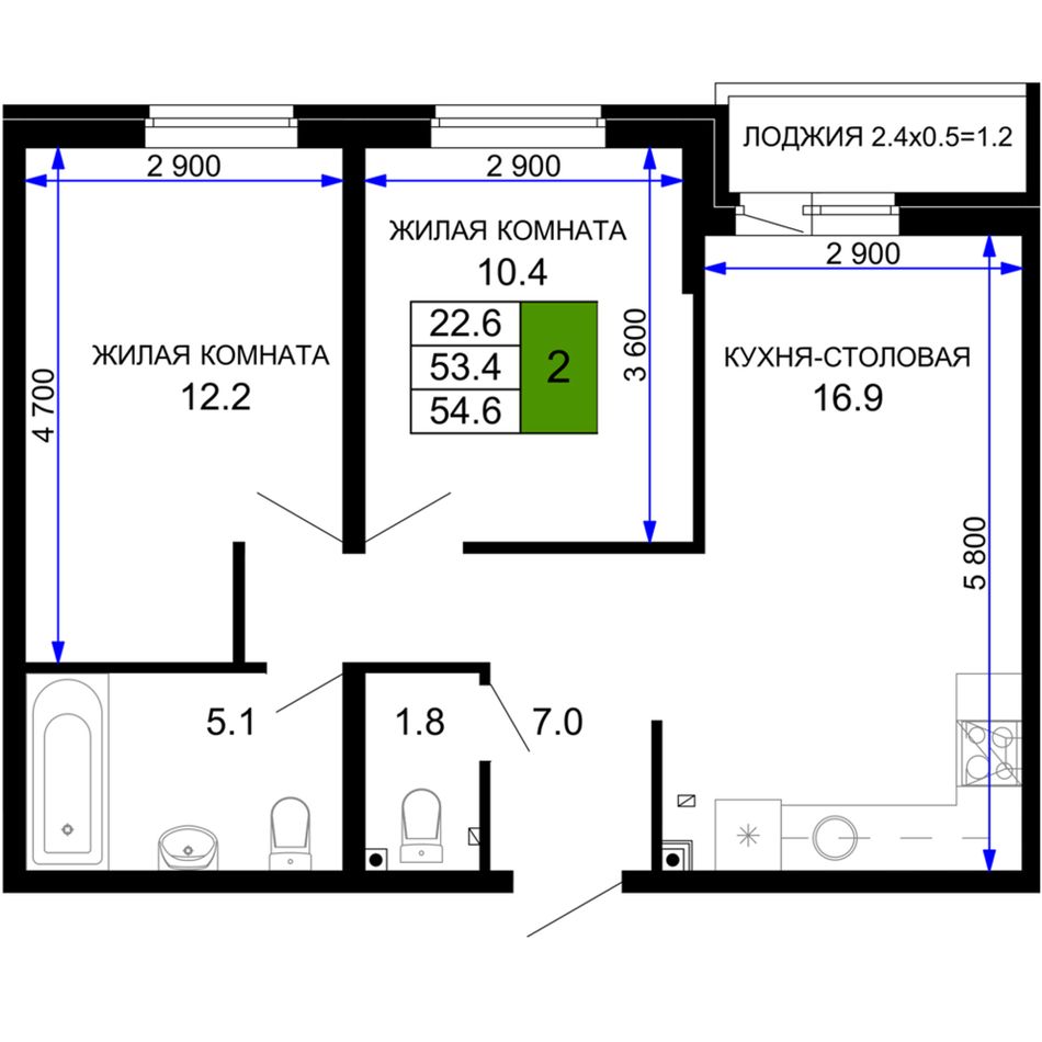2-комнатная — 55,1 м² 2/16 эт. в Дыхание