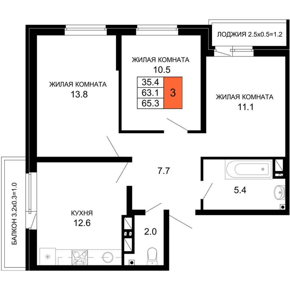 3-комнатная — 65,84 м² 4/16 эт. в Дыхание