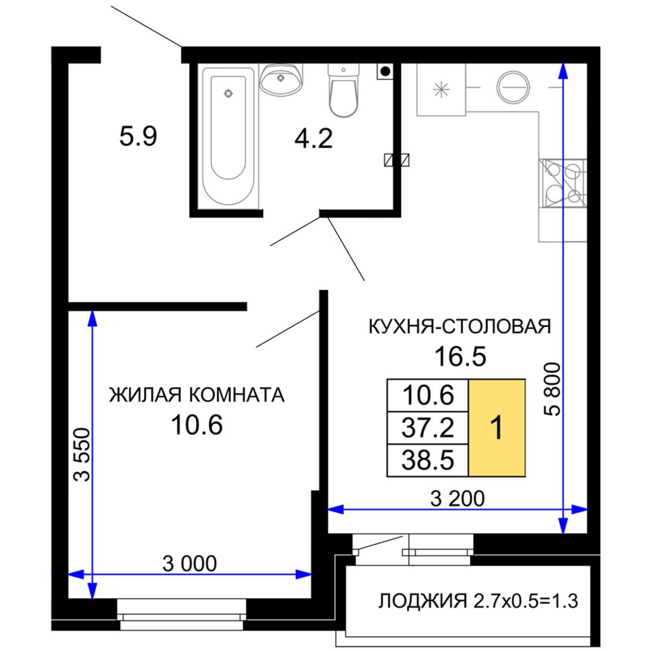 1-комнатная — 38,85 м² 2/16 эт. в Дыхание