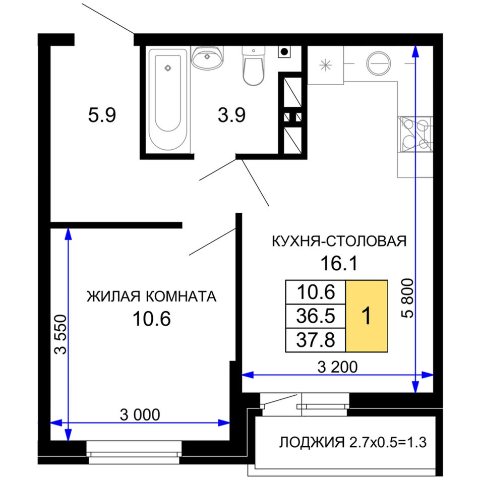 1-комнатная — 38,25 м² 4/16 эт. в Дыхание