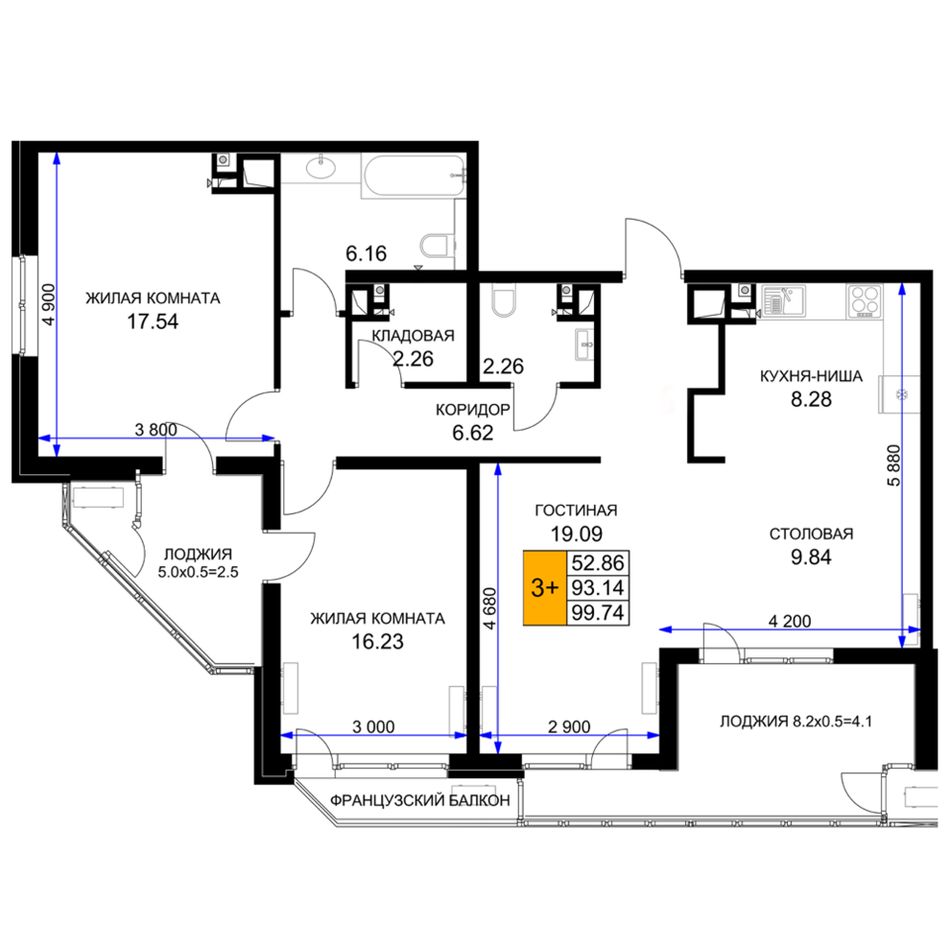 3-комнатная — 93,25 м² 16/16 эт. в Сегодня