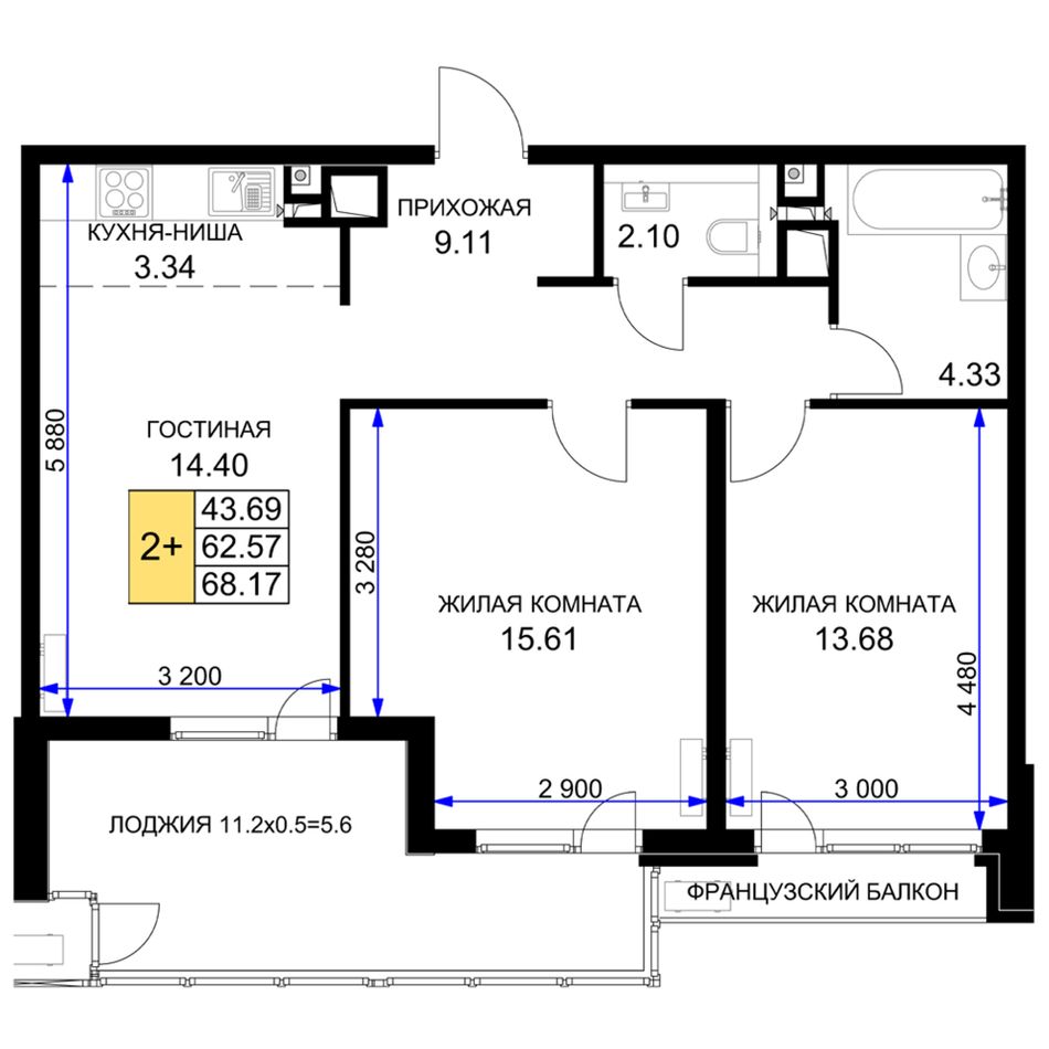 2-комнатная — 68,55 м² 15/16 эт. в Сегодня