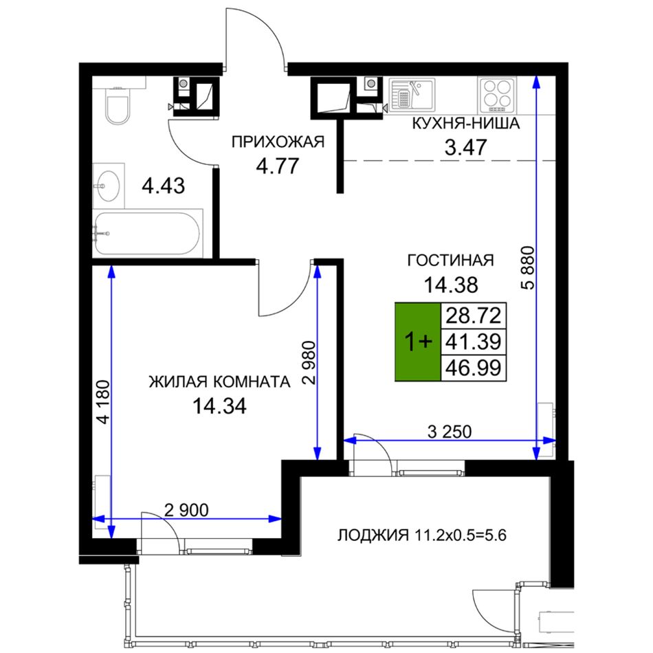 1-комнатная — 47,8 м² 15/16 эт. в Сегодня