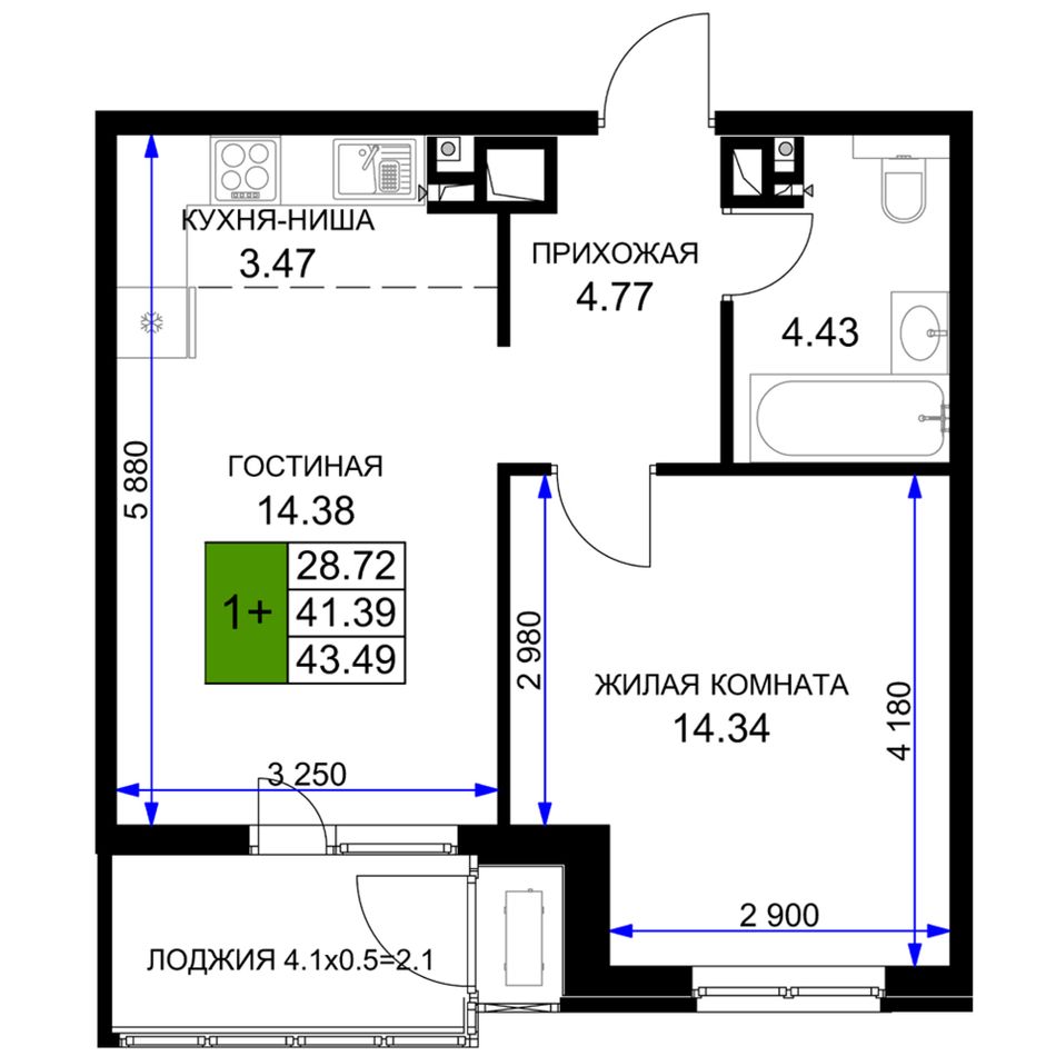 1-комнатная — 43,85 м² 12/16 эт. в Сегодня