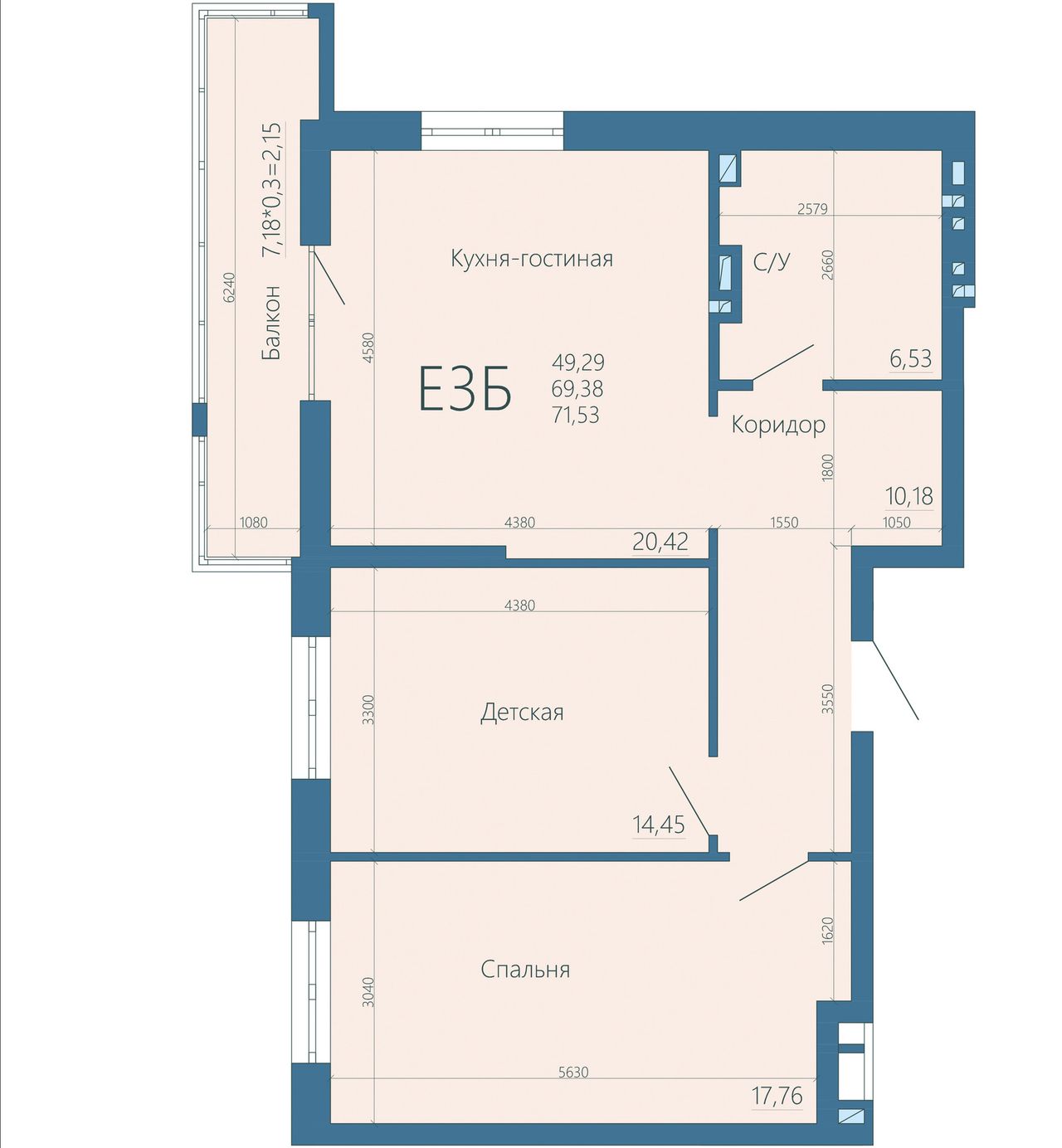 3-комнатная — 71,29 м² 2/15 эт. в Наследие