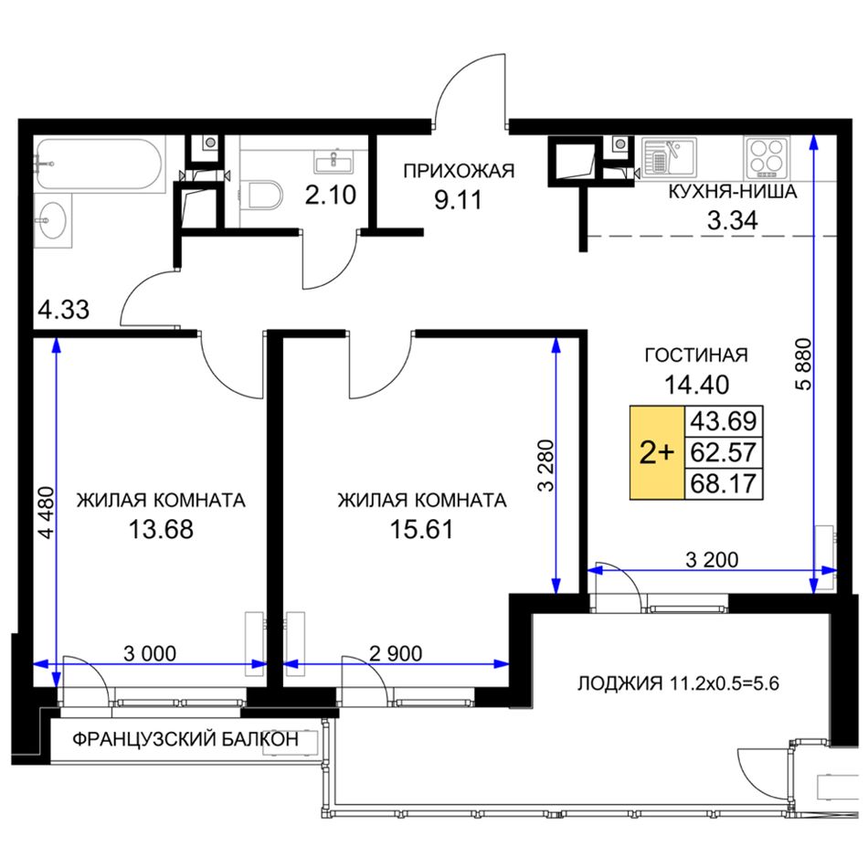 2-комнатная — 69,05 м² 14/16 эт. в Сегодня