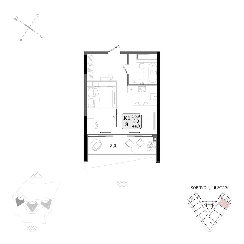 Продаются апартаменты № 1/008 площадью 44,9 м2