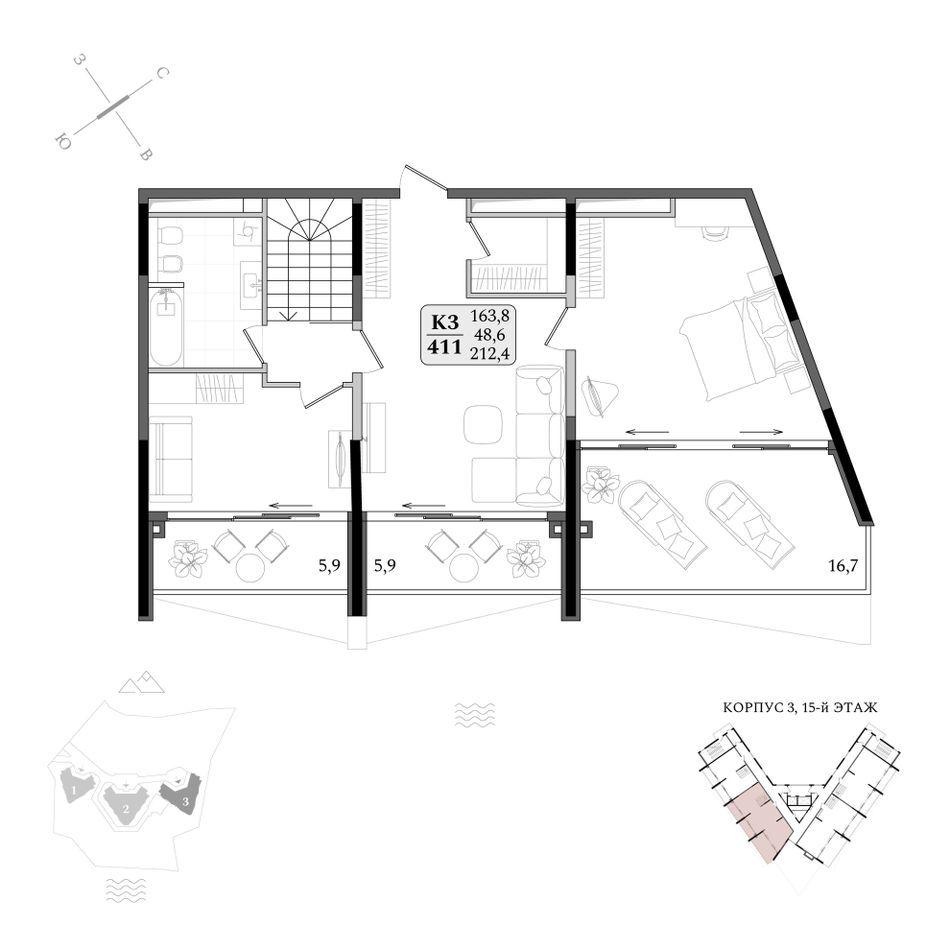 В комплексе представлена широкая линейка планировочных решений от студий до двухуровневых пентхаусов на последних этажах.
