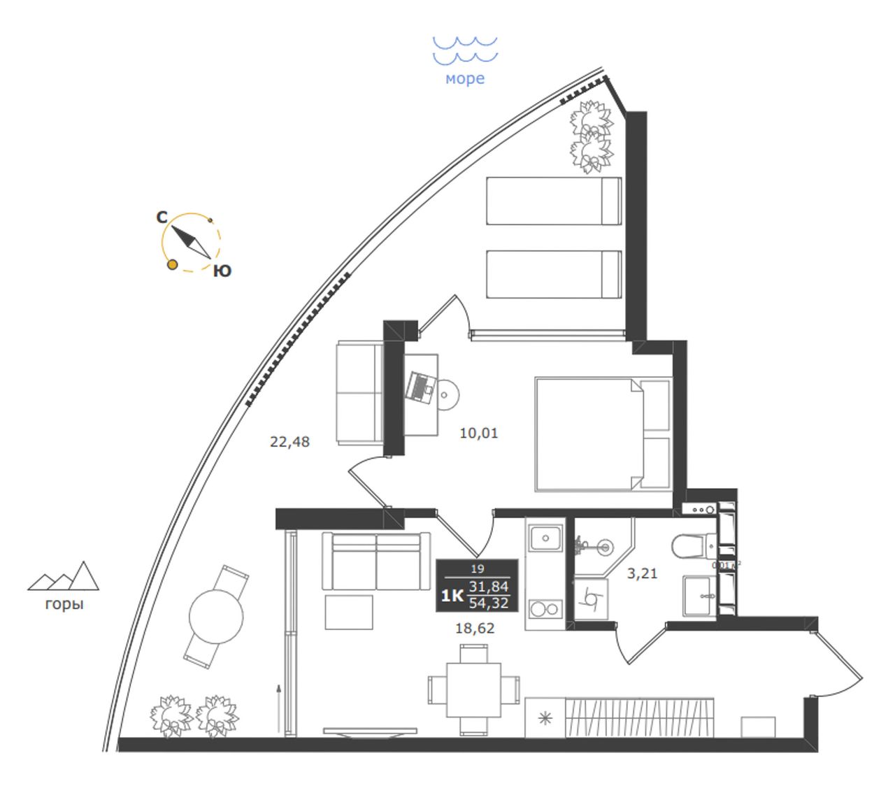 1-комнатная — 54,32 м² 4/11 эт. в Паруса мечты
