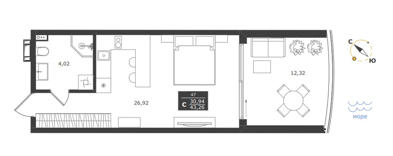 Студия — 43,26 м² 7/11 эт. в Паруса мечты