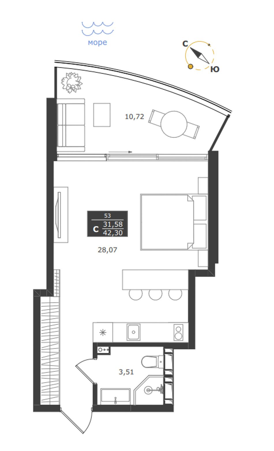 Студия — 42,3 м² 8/11 эт. в Паруса мечты