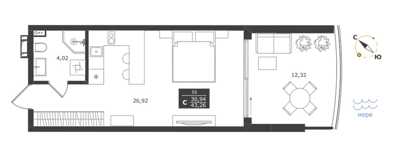 Студия — 43,26 м² 8/11 эт. в Паруса мечты