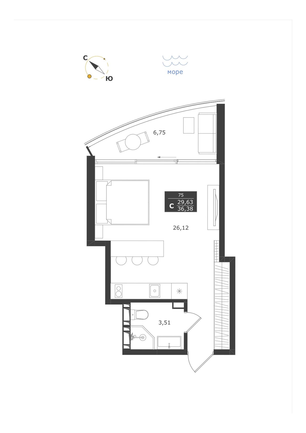 Студия — 36,38 м² 11/11 эт. в Паруса мечты
