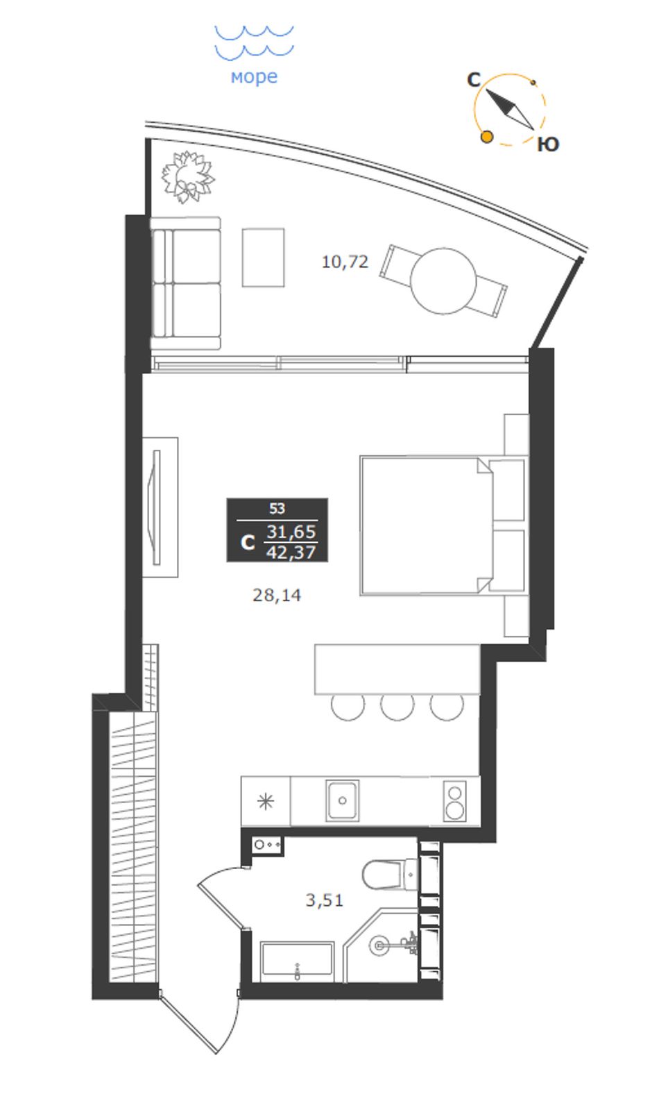 Студия — 42,37 м² 8/11 эт. в Паруса мечты