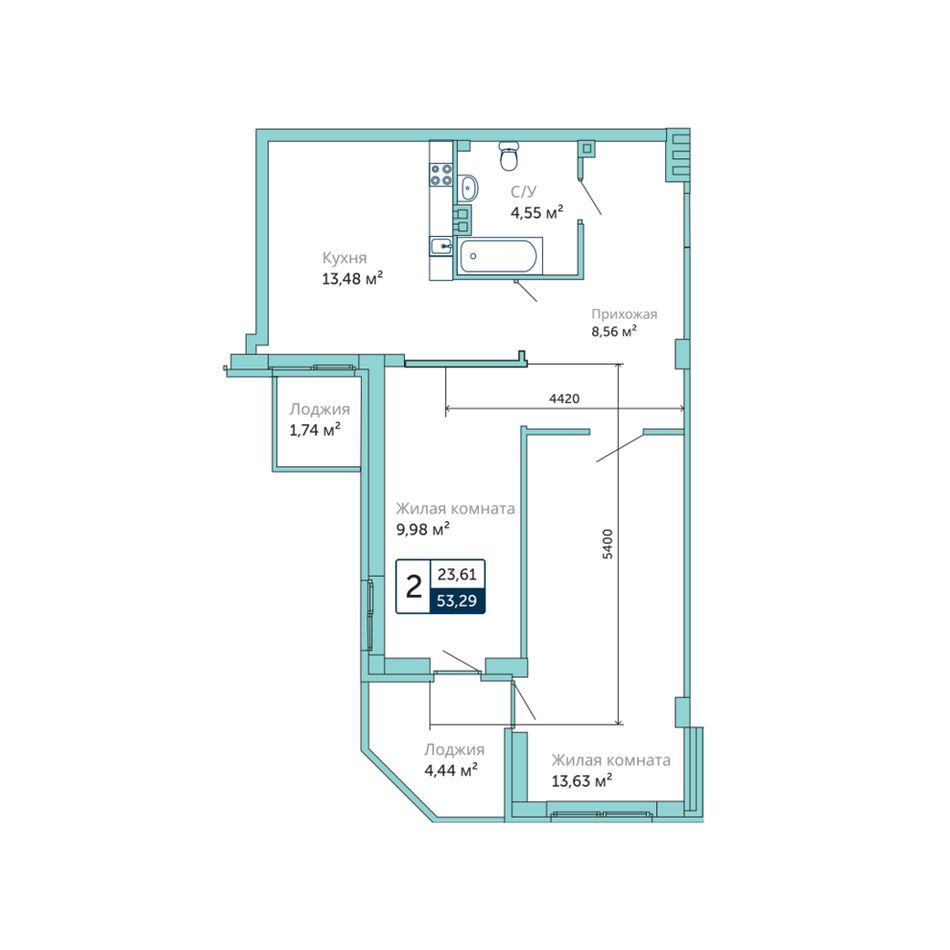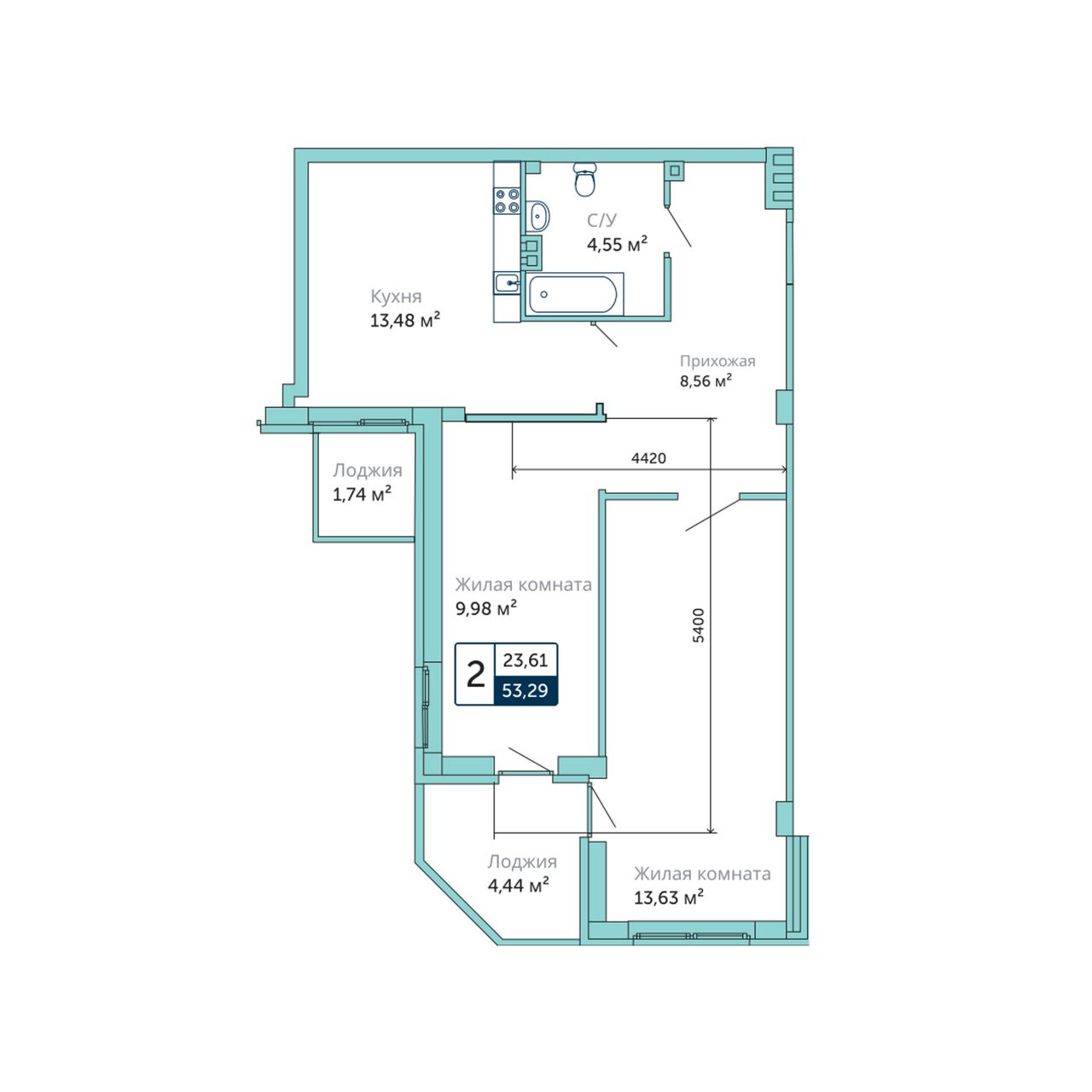 2-комнатная — 52,7 м² 12/13 эт. в Семейный