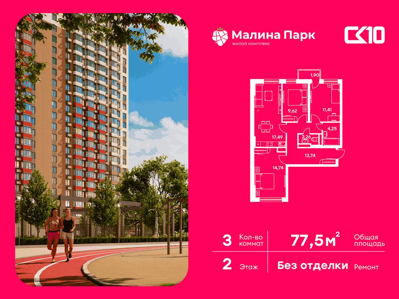 3-комнатная — 77,5 м² 2/25 эт. в Малина Парк