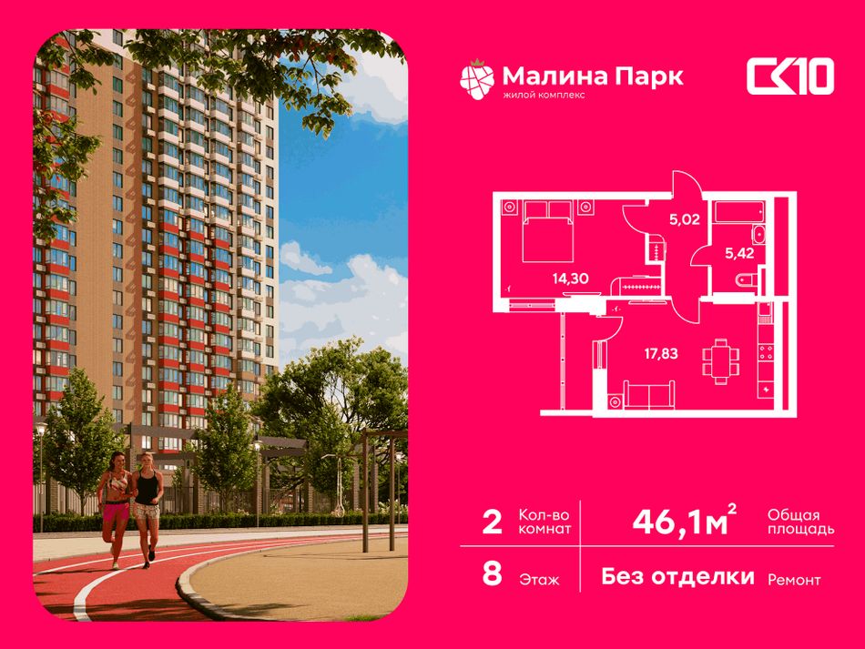 Просторная 2-комнатная квартира площадью 46,13 м² расположена на 8 этаже жилого комплекса «МАЛИНА ПАРК». Кухня площадью 0 м² функционально спланирована для удобства готовки. Светлые жилые комнаты общей площадью 14,3/17,83 м² создают уютную атмосферу для отдыха и работы.