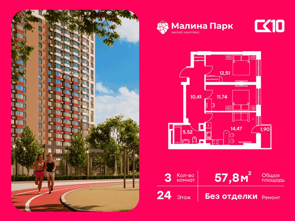 Просторная 3-комнатная квартира площадью 57,75 м² расположена на 24 этаже жилого комплекса «МАЛИНА ПАРК». Кухня площадью 0 м² функционально спланирована для удобства готовки. Светлые жилые комнаты общей площадью 11,74/12,51/14,47 м² создают уютную атмосферу для отдыха и работы.