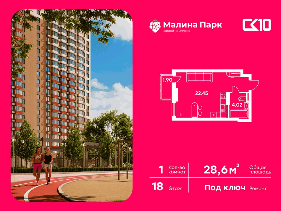 Просторная 1-комнатная квартира площадью 28,62 м² расположена на 18 этаже жилого комплекса «МАЛИНА ПАРК». Кухня площадью 0 м² функционально спланирована для удобства готовки. Светлые жилые комнаты общей площадью м² создают уютную атмосферу для отдыха и работы.