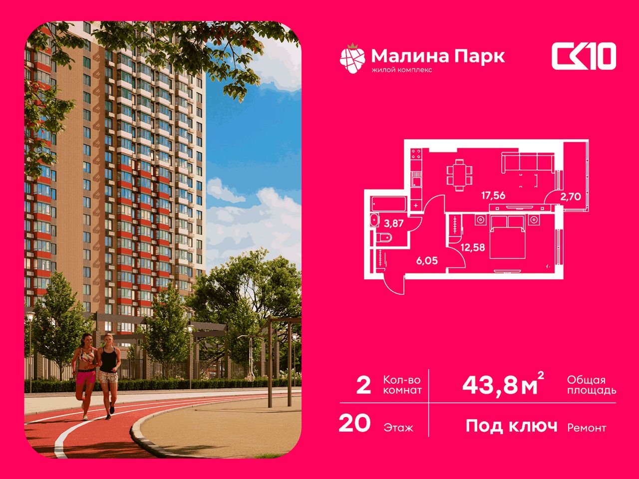 Просторная 2-комнатная квартира площадью 43,82 м² расположена на 20 этаже жилого комплекса «МАЛИНА ПАРК». Кухня площадью 0 м² функционально спланирована для удобства готовки. Светлые жилые комнаты общей площадью м² создают уютную атмосферу для отдыха и работы.