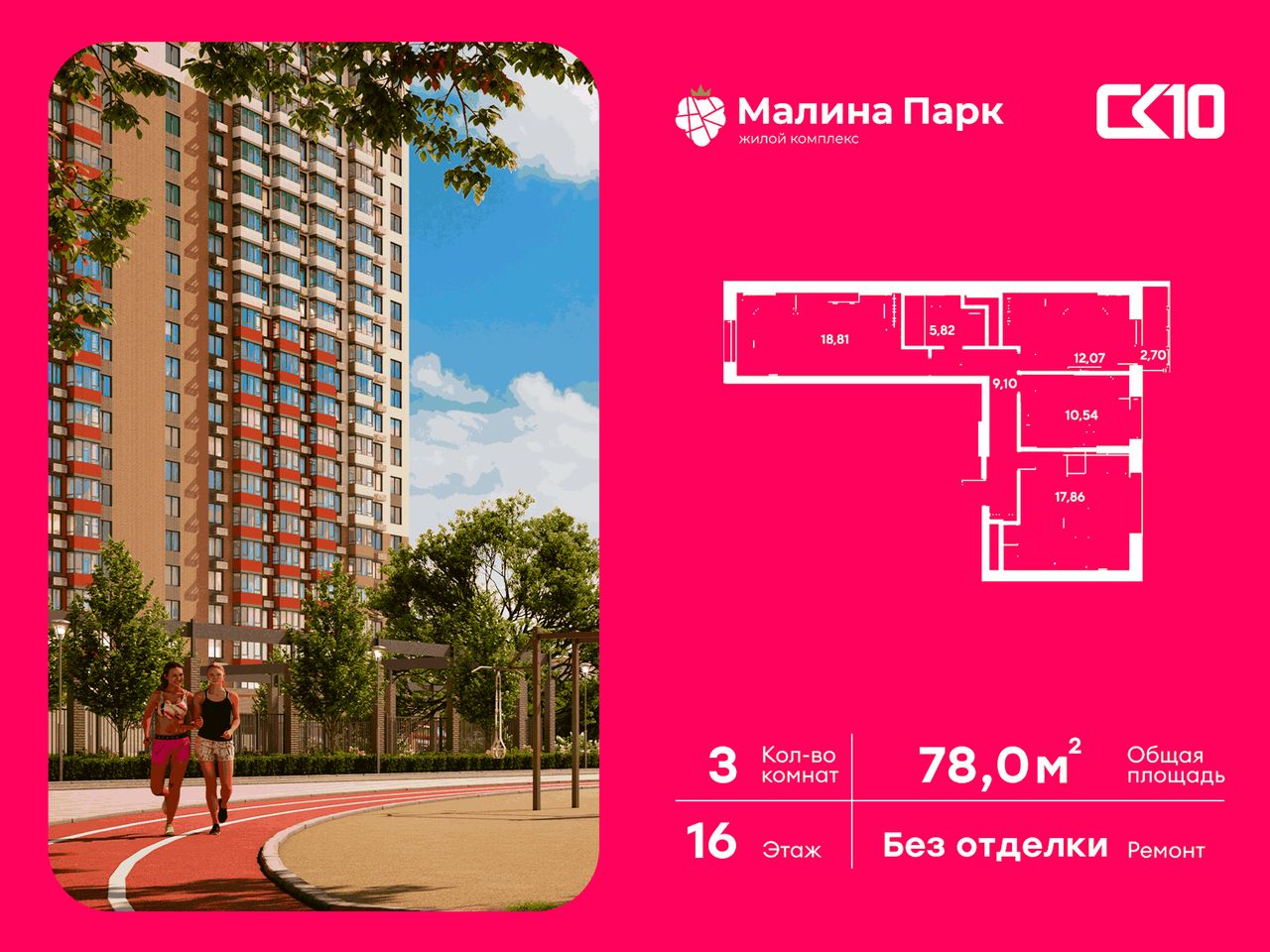 Просторная 3-комнатная квартира площадью 77,95 м² расположена на 16 этаже жилого комплекса «МАЛИНА ПАРК». Кухня площадью 17,98 м² функционально спланирована для удобства готовки. Светлые жилые комнаты общей площадью 18,81/12,07/10,54 м² создают уютную атмосферу для отдыха и работы.