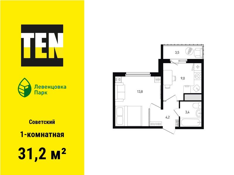 1-комнатная — 31,2 м² 4/12 эт. в Концепт-проект «Левенцовка Парк»